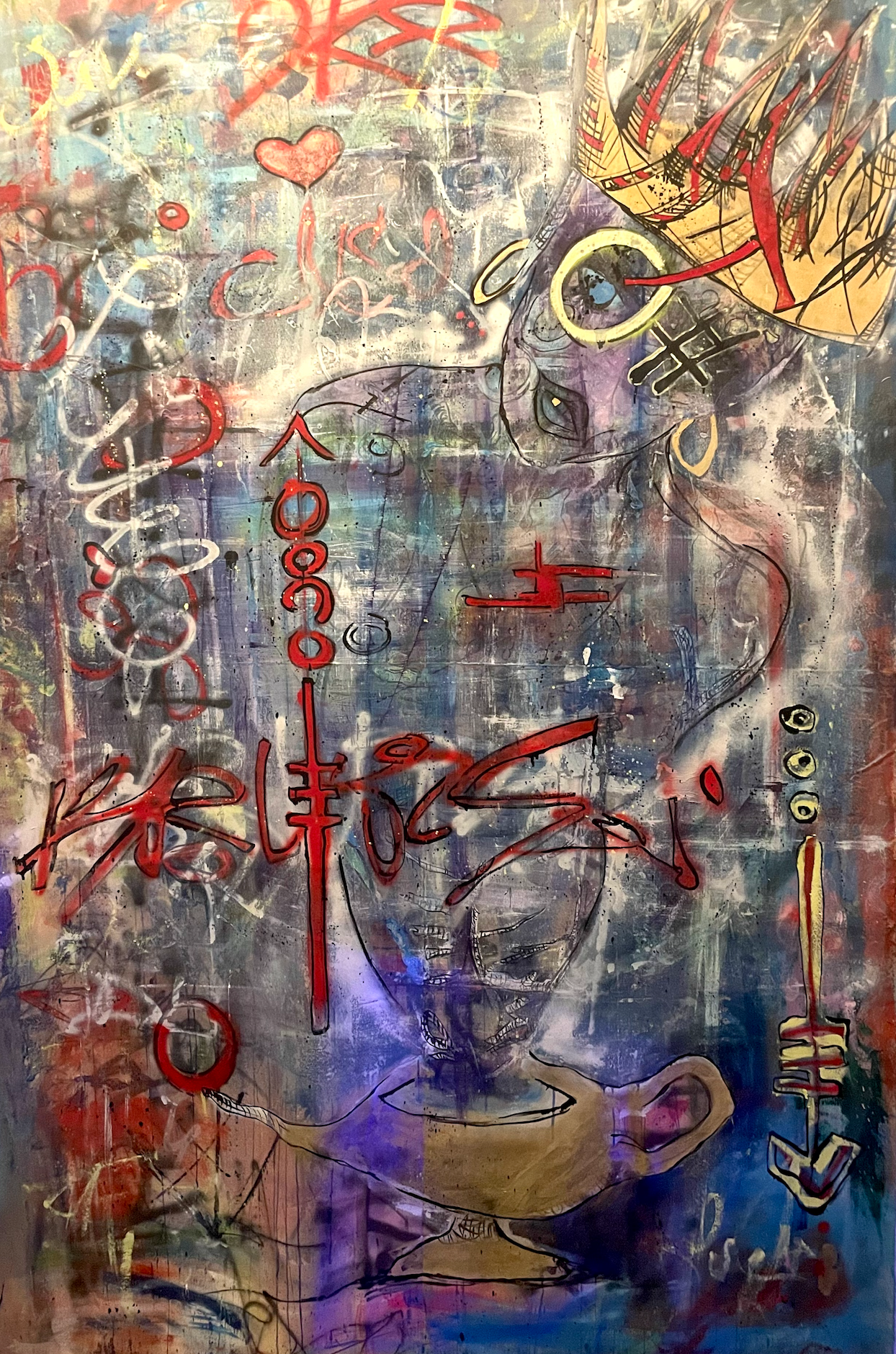 Acrylic, spray paint, oil on unstretched canvas