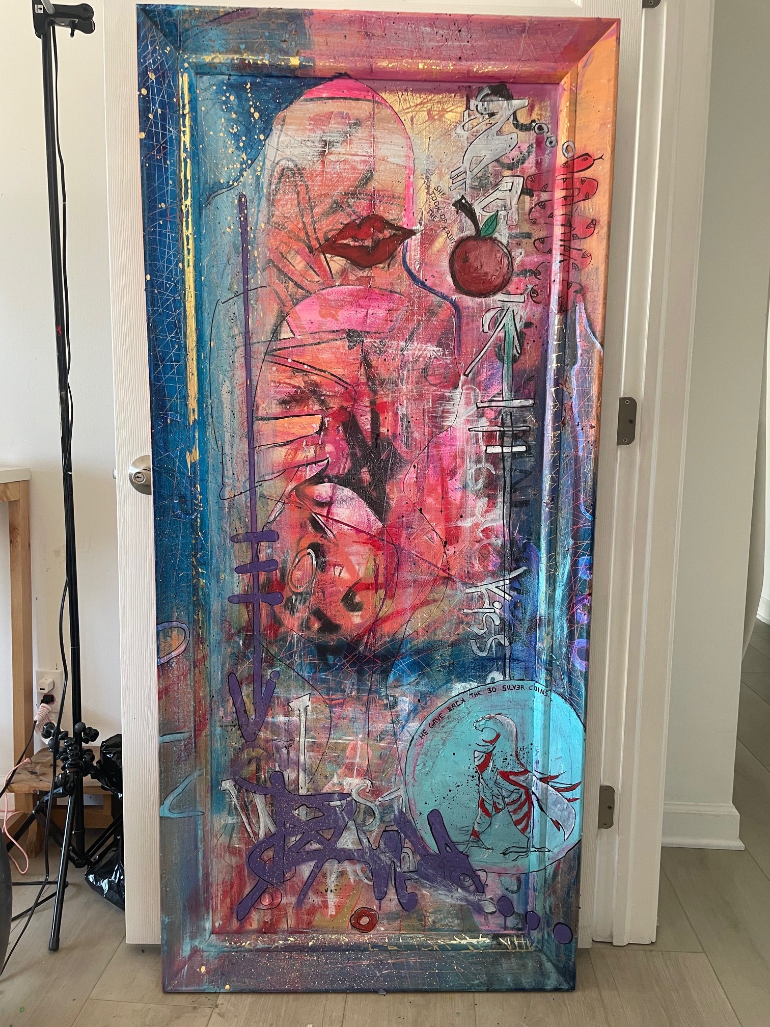In the painting, Nicole asks the question, "Who is the hero?" In addition to symbolic visuals from Eve and Judas' story, Nicole includes lines of scripture from the Bible that detail glimpses into the relatable motives for each character's actions. Eve: "And when the woman saw that the tree was good ... to make one wise, she took of the fruit." Judas: "He gave back the 30 silver coins."